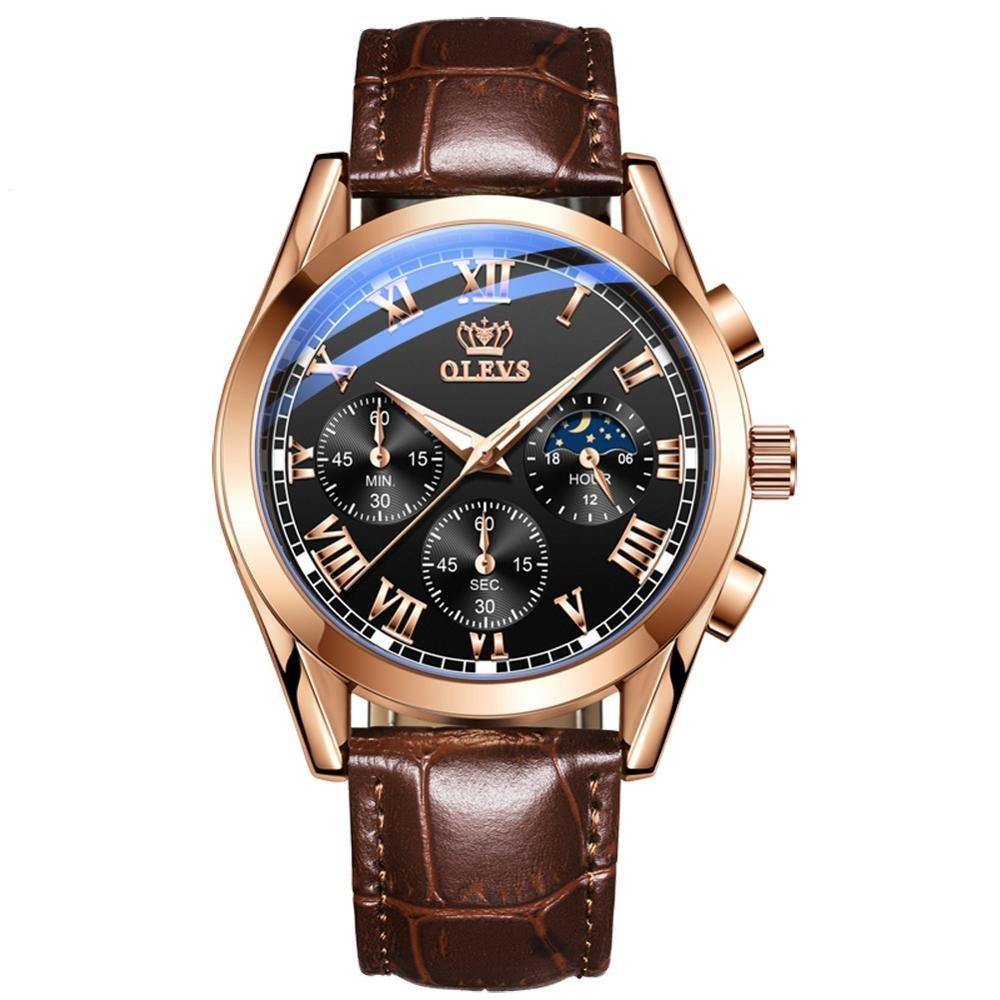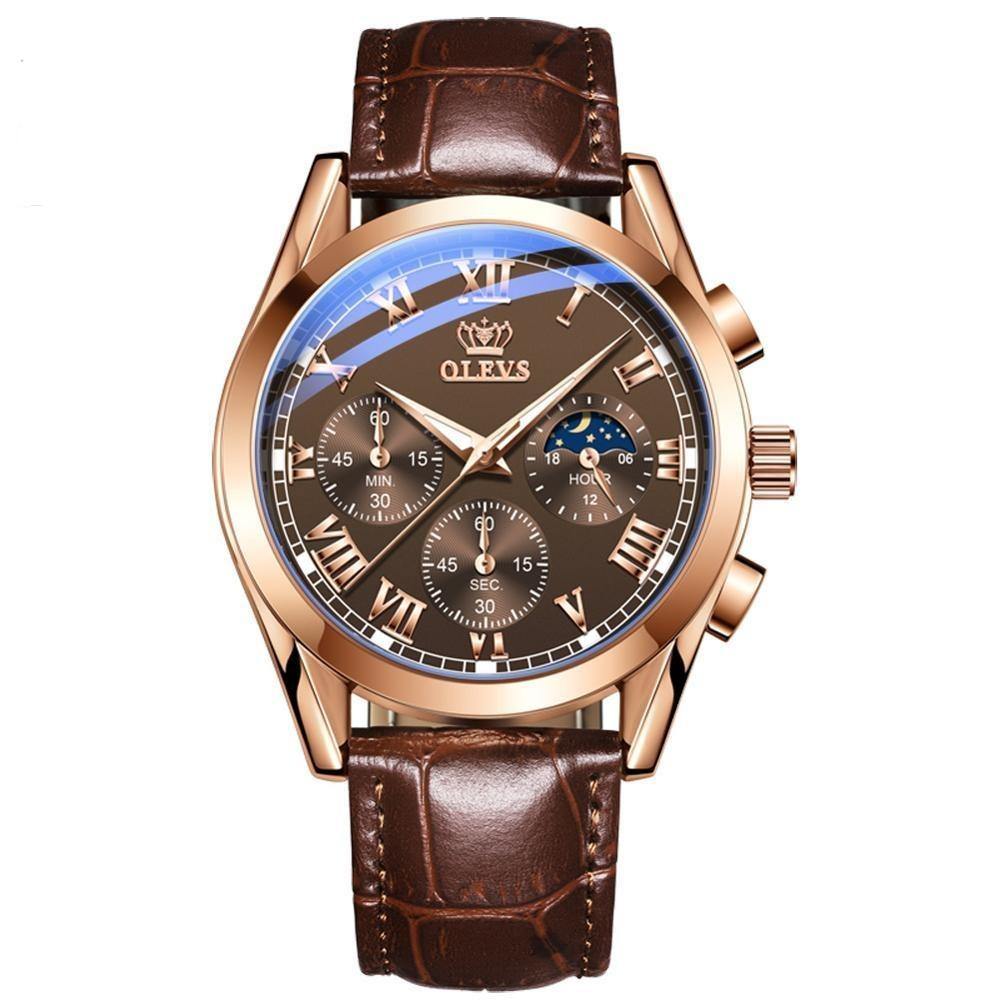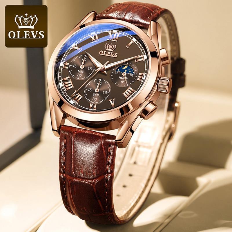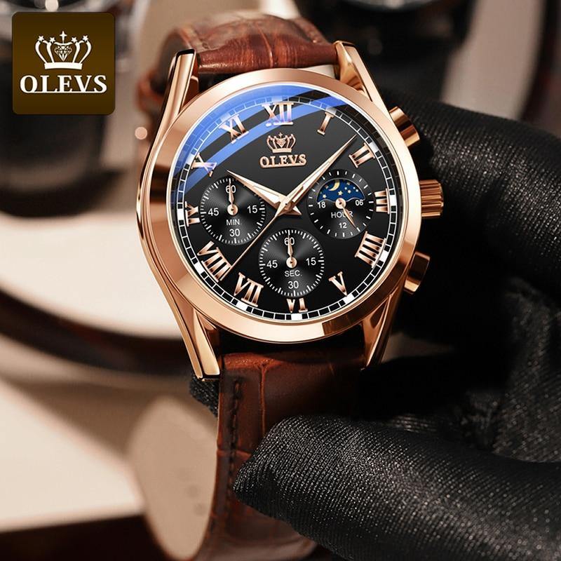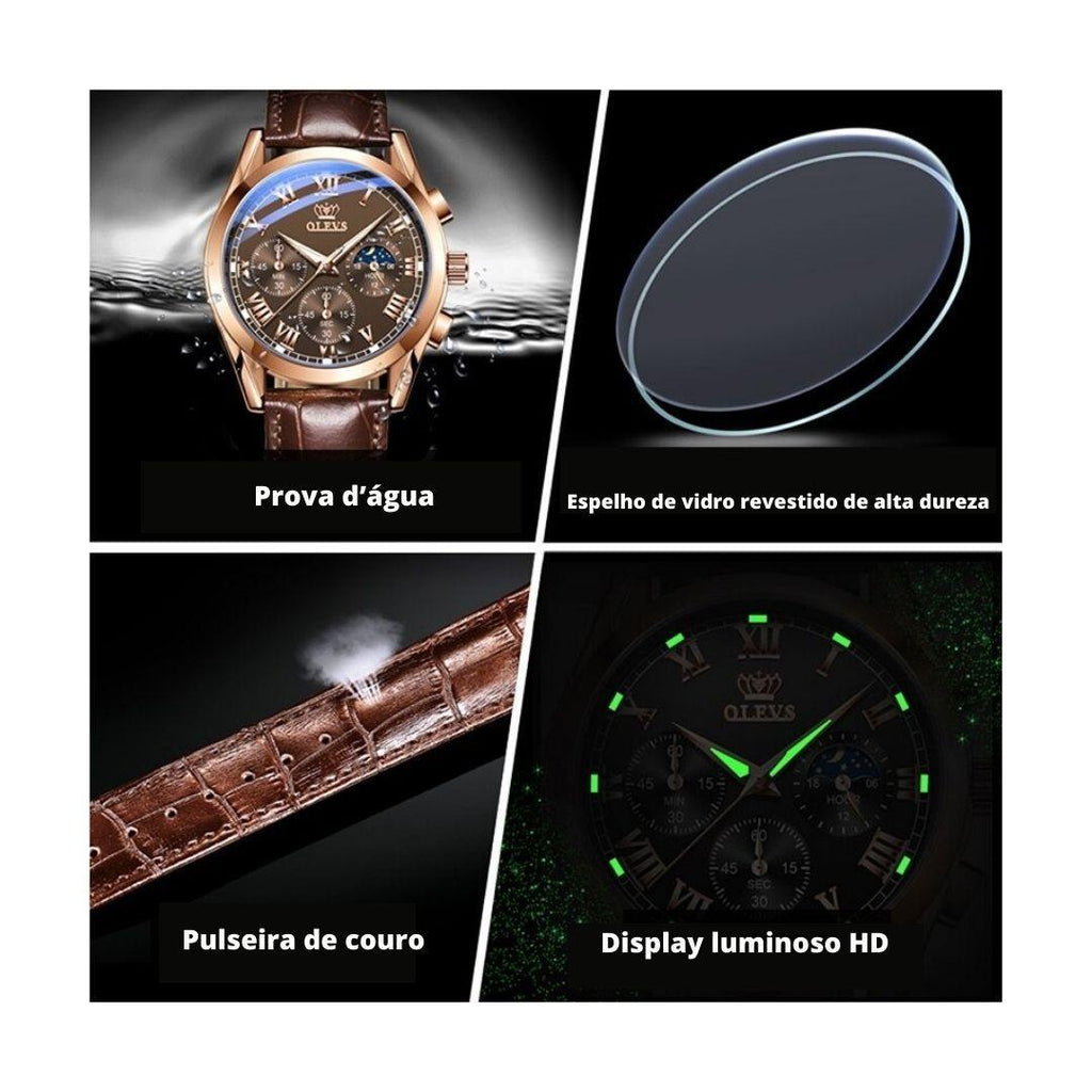 Os cronógrafos ganham destaque no fundo do mostrador. Completo e elegante, o relógio OLEVS é confeccionado em aço inoxidável, garantindo a resistência adequada. A pulseira em couro legítimo feita a mão dá um toque de modernidade e seus traços marcantes são perfeitos para homens com personalidades intensas.