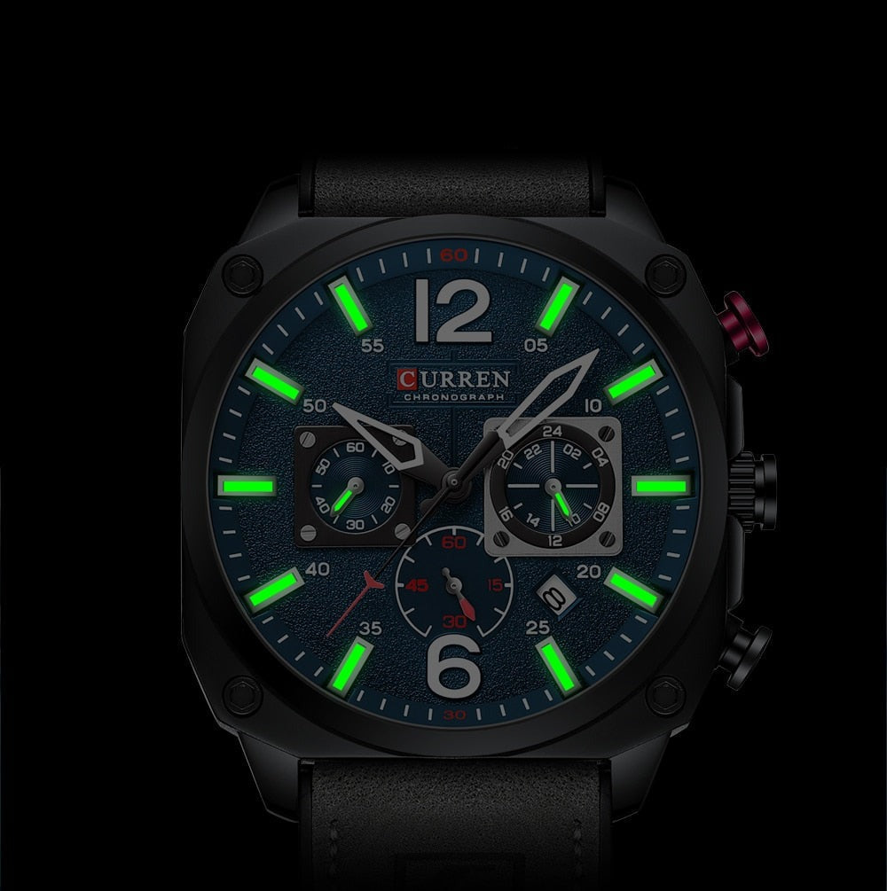 Possui cronógrafos e todos são funcionais que ganham grande destaque no fundo do mostrador, completo e elegante todo confeccionado em couro de extrema qualidade garantindo a resistência adequada.