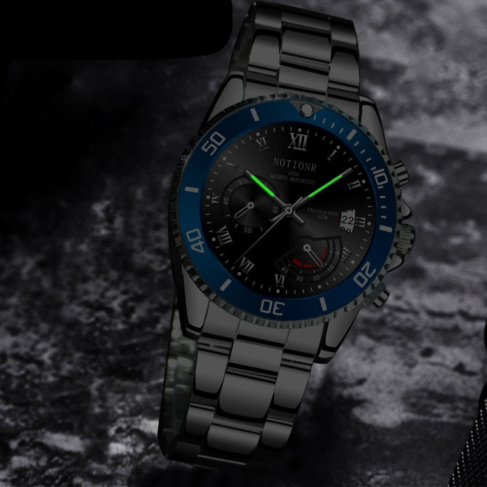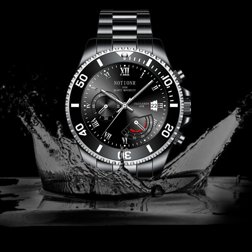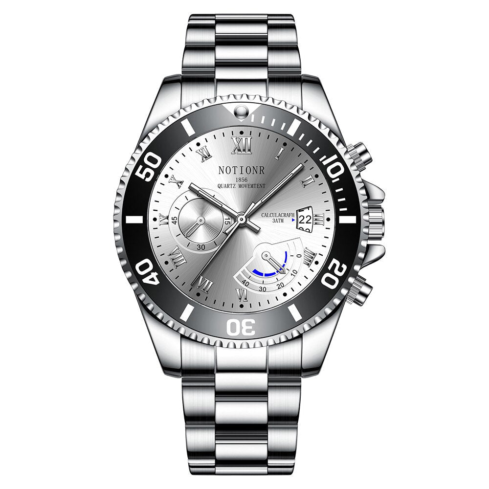 O relógio Quartzo NOTNR possui cronógrafos que ganham grande destaque no fundo do mostrador, completo e elegante todo confeccionado em aço inox "inoxidável" de extrema qualidade garantindo a resistência adequada, possui uma linda pulseira de 3 fechos com pino de segurança dando conforto e segurança durante o uso